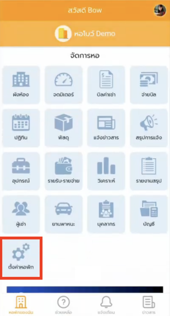 1. เข้าหมวด ตั้งค่าหอพัก