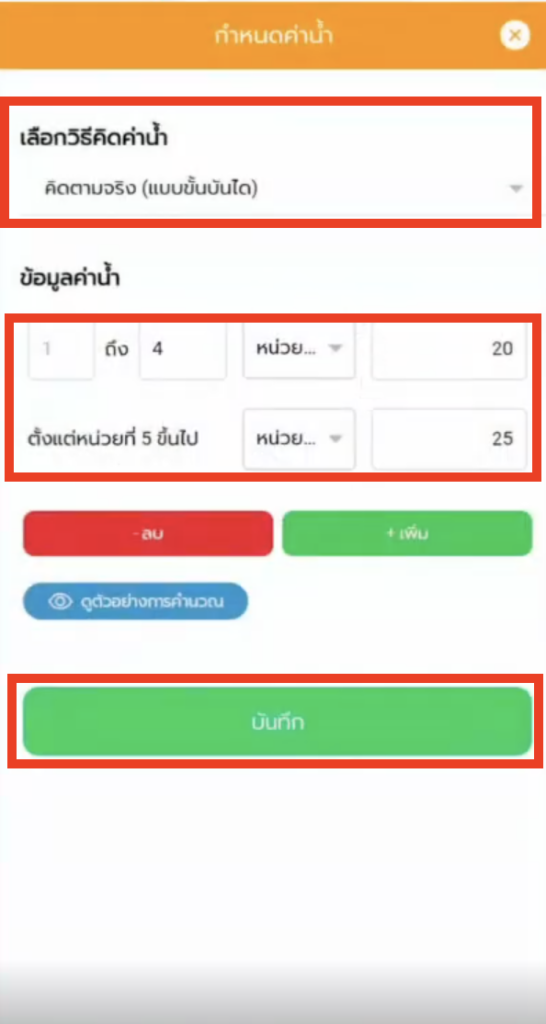 การตั้งค่าน้ำ-ค่าไฟ รูปแบบคิดตามจริง(แบบขั้นบันได) คือ การคิดค่าบริการในอัตราที่แตกต่างกันไปตามปริมาณการใช้ โดยใช้สูตรคำนวณที่แตกต่างกันสำหรับแต่ละช่วง (ขั้นบันได) ของการใช้ มีขั้นตอนดังนี้